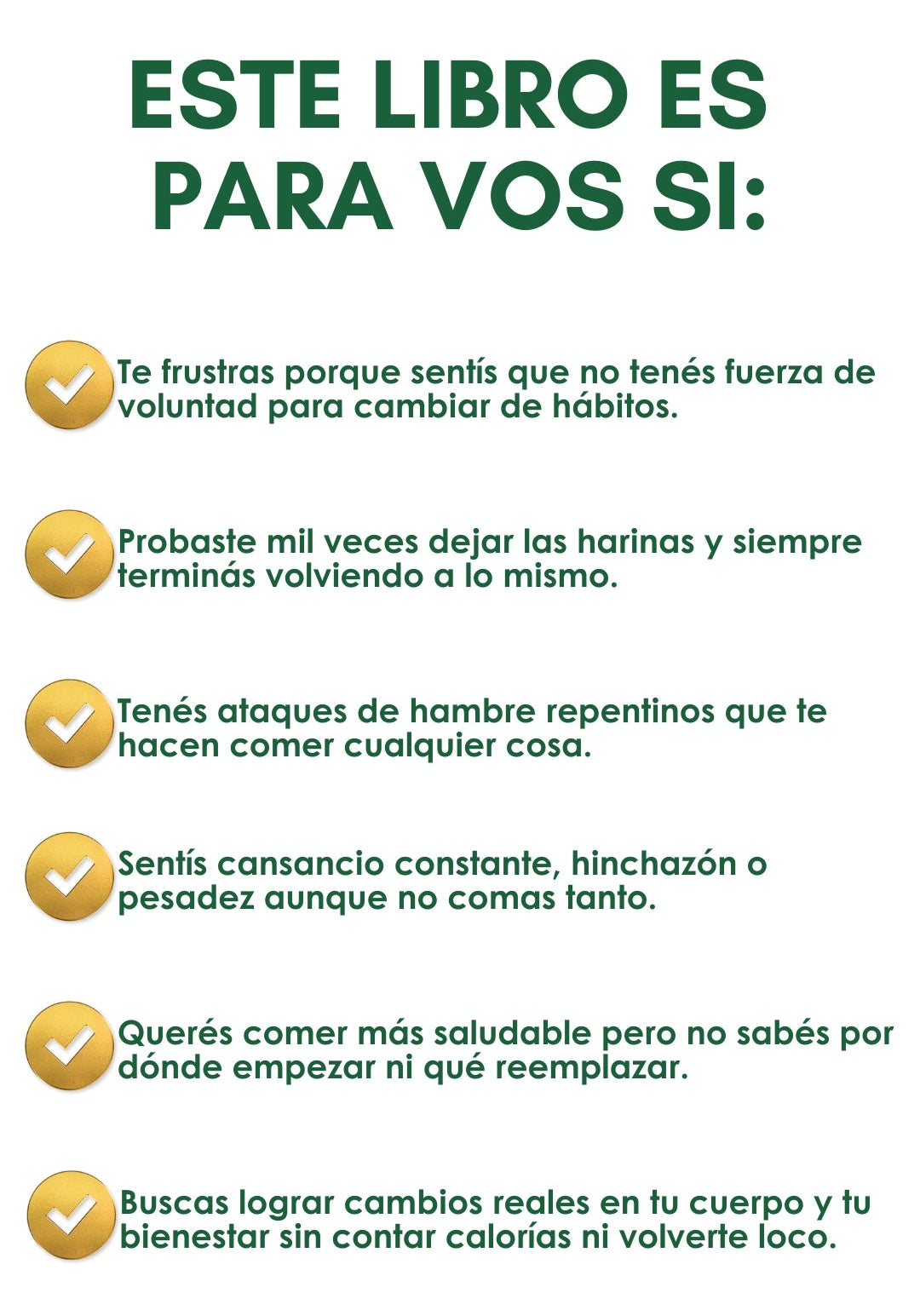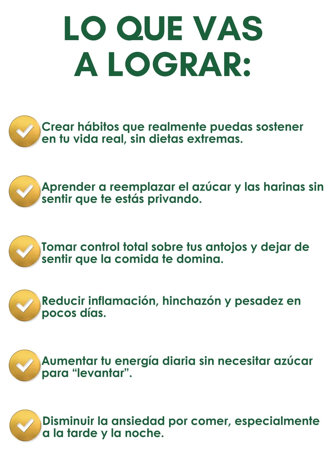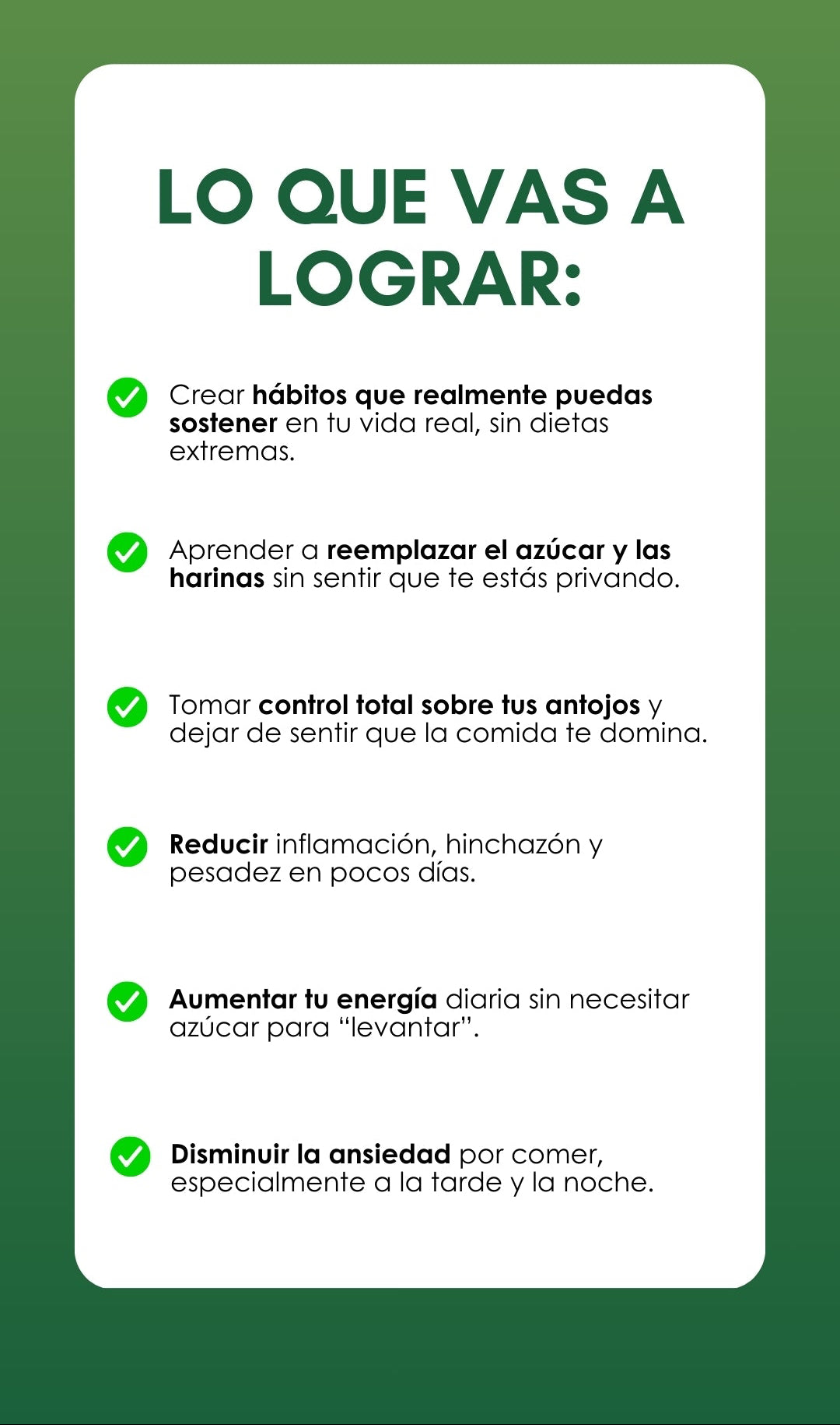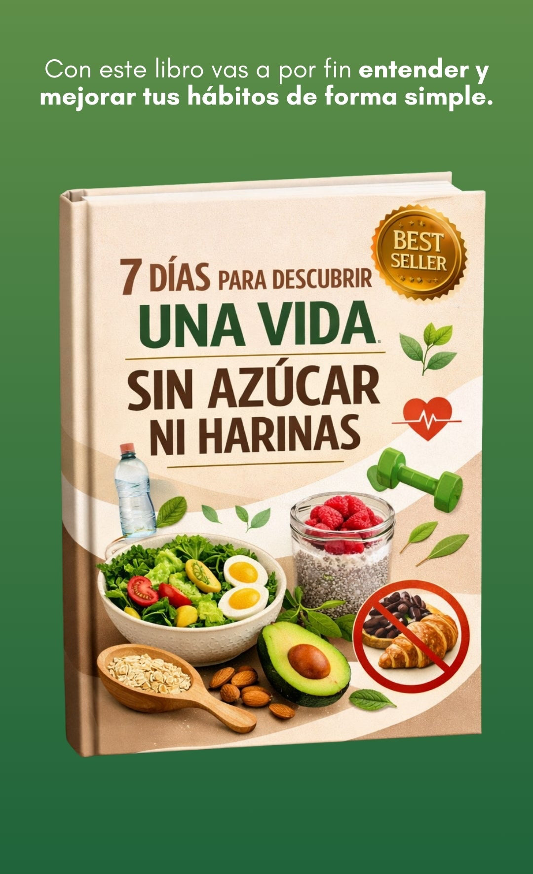 Vas a aprender un plan simple para dejar el azúcar y las harinas en 7 días, cómo controlar antojos, qué comer, cómo organizarte y cómo crear hábitos que puedas sostener.